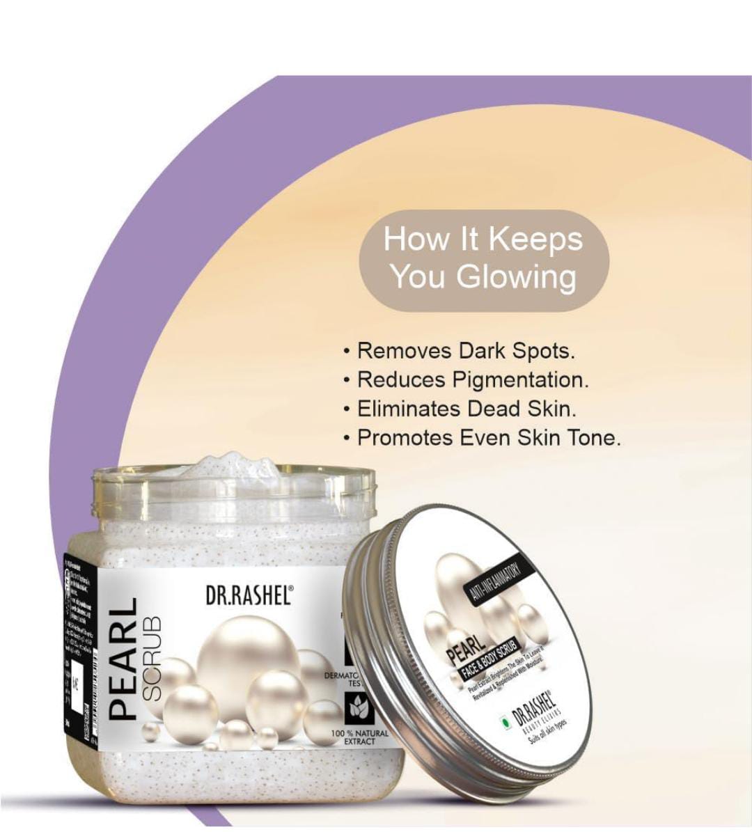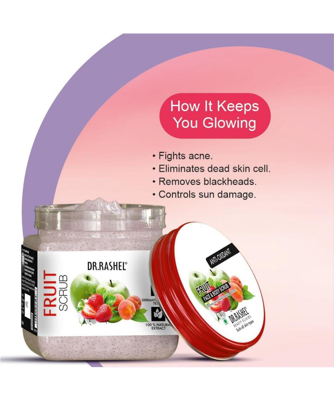 DR.RASHEL scrubs/ Fruit scrub/ DE-Tan scrub/ UBTAN scrub/ CHARCOAL Scrub/ APRICOT scrub/ RICE WATER scrub/MULTANI MITTI scrub/ PERAL scrub/ KOREAN GLASS SKIN scrub