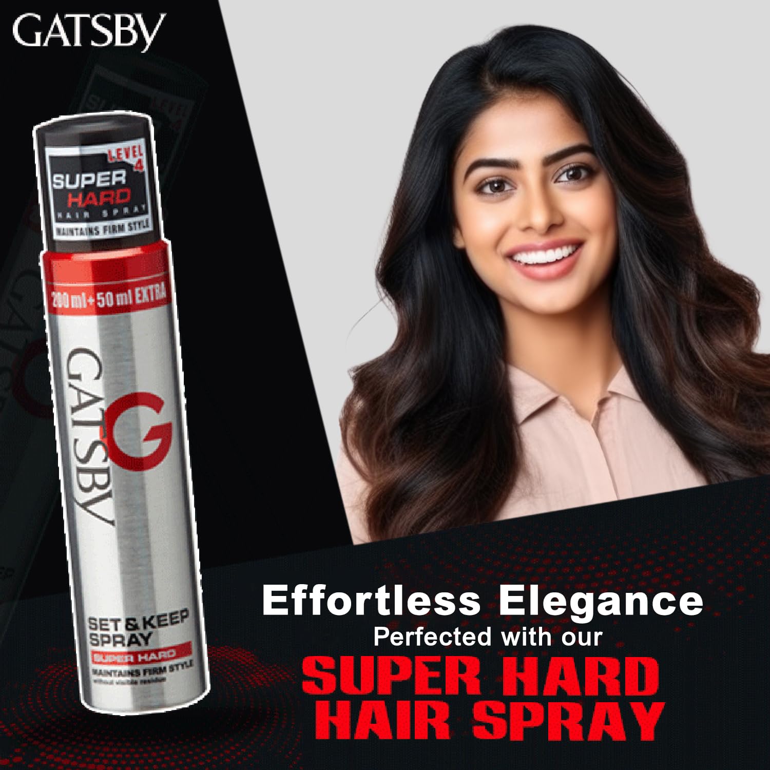 Gatsby Japan Set And Keep Hair Spray Super Hard, 250ml | Quick Drying, Long Lasting Hold, No Flaking & Natural Shine | Non Sticky & Easy Wash Off | Styling Hair Spray