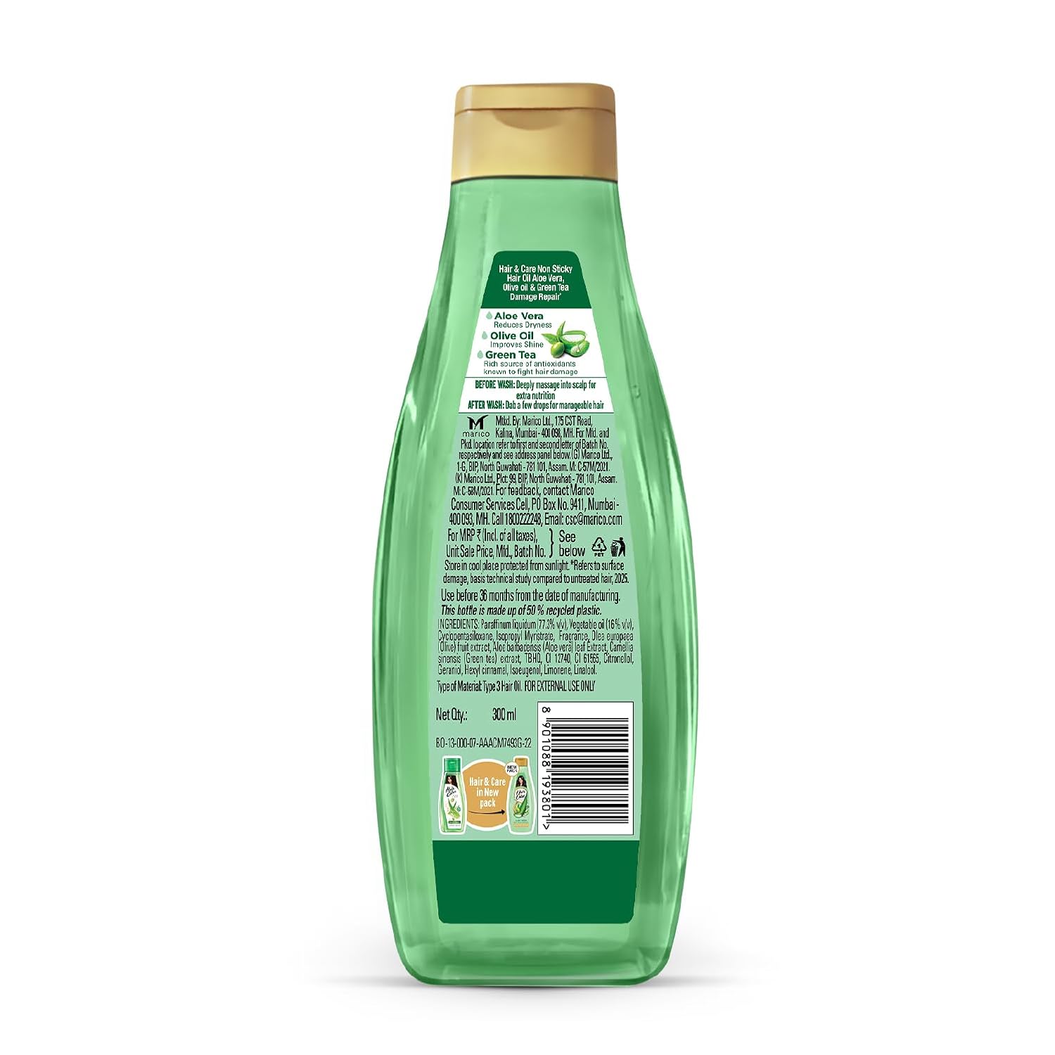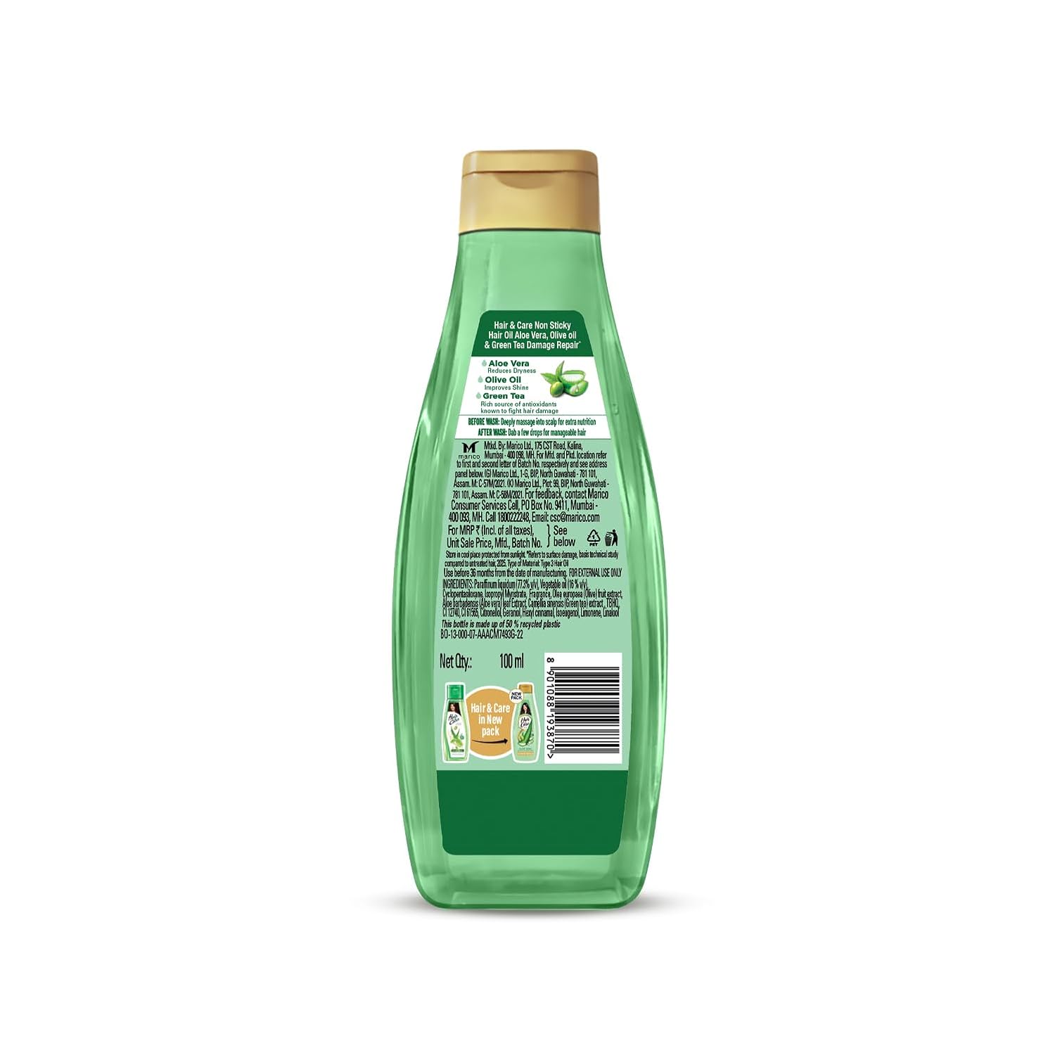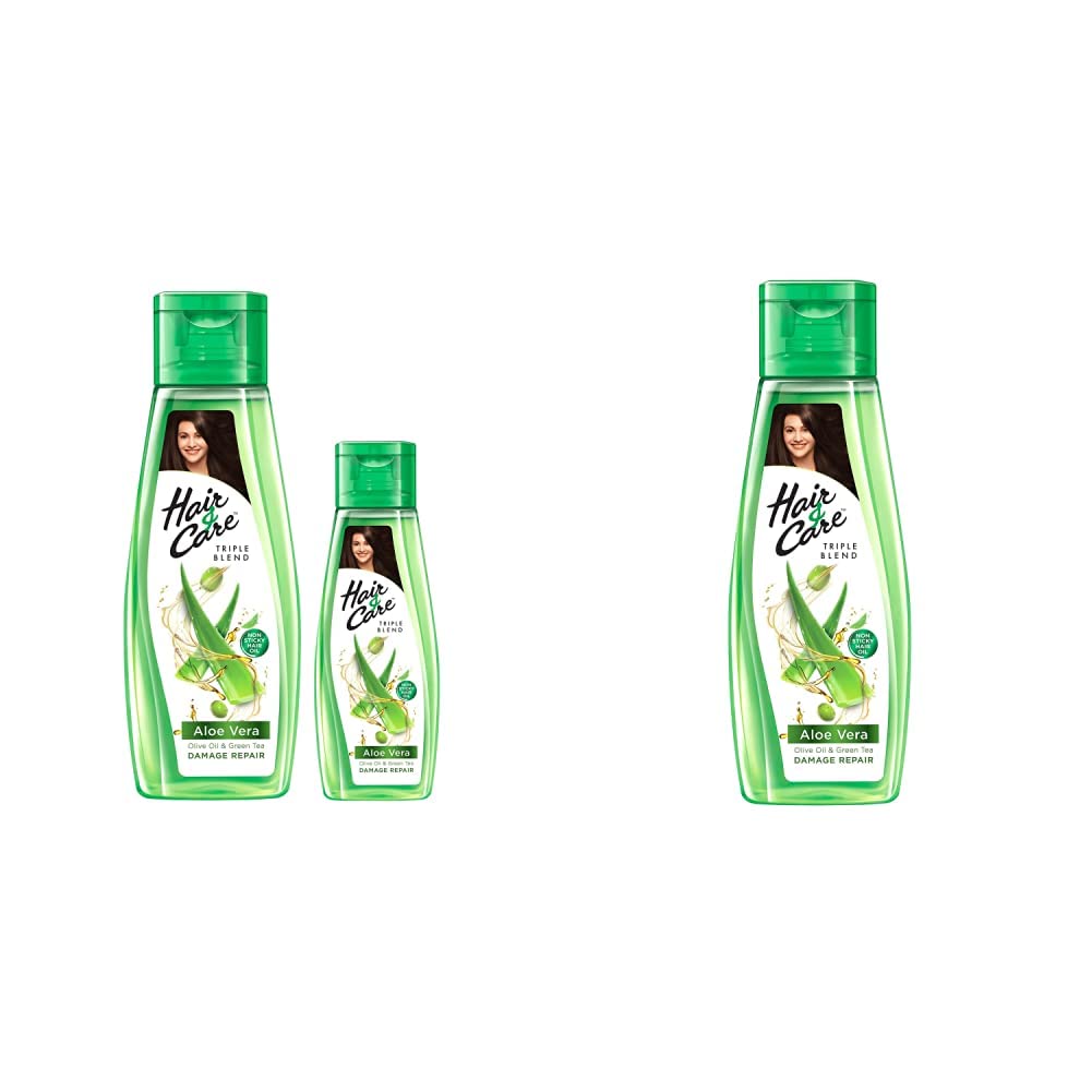 Now Say Goodbye to your hair worries! The new Hair & Care Triple Blend Oil enriched with Aloe Vera, Olive Oil & Green Tea repairs up to 100 % hair damage*. It is light and non-sticky and comes with the classic, loved Hair & Care fragrance. This hair oil cares for dry hair, frizzy hair and rough hair and helps repair these signs of damage to give soft, smooth & bouncy hair. It is enriched with Aloe Vera, Olive Oil and Green Tea. Aloe Vera soothes itchy scalp, reduces dryness, deep conditions the hair and protects it from sun damage thus leaving your hair soft, smooth and shiny hair. Olive oil, known to be rich in Vitamin E and antioxidants, moisturises hair, and prevents scalp irritation, giving strong and nourished hair. Green tea, rich in anti-fungal and anti-inflammatory properties, improves hair health and adds shine to damaged, dyed and chemically treated hair. The non-sticky and light formula of the hair oil also lets you set your hair post washing. Dab just a bit after wash and style it the way you want. Get damage free hair with the new Hair & Care Damage Repair Triple Blend Non-Sticky Hair Oil! *Refers to surface damage. Based on lab studies on hair breakage vs untreated hair.