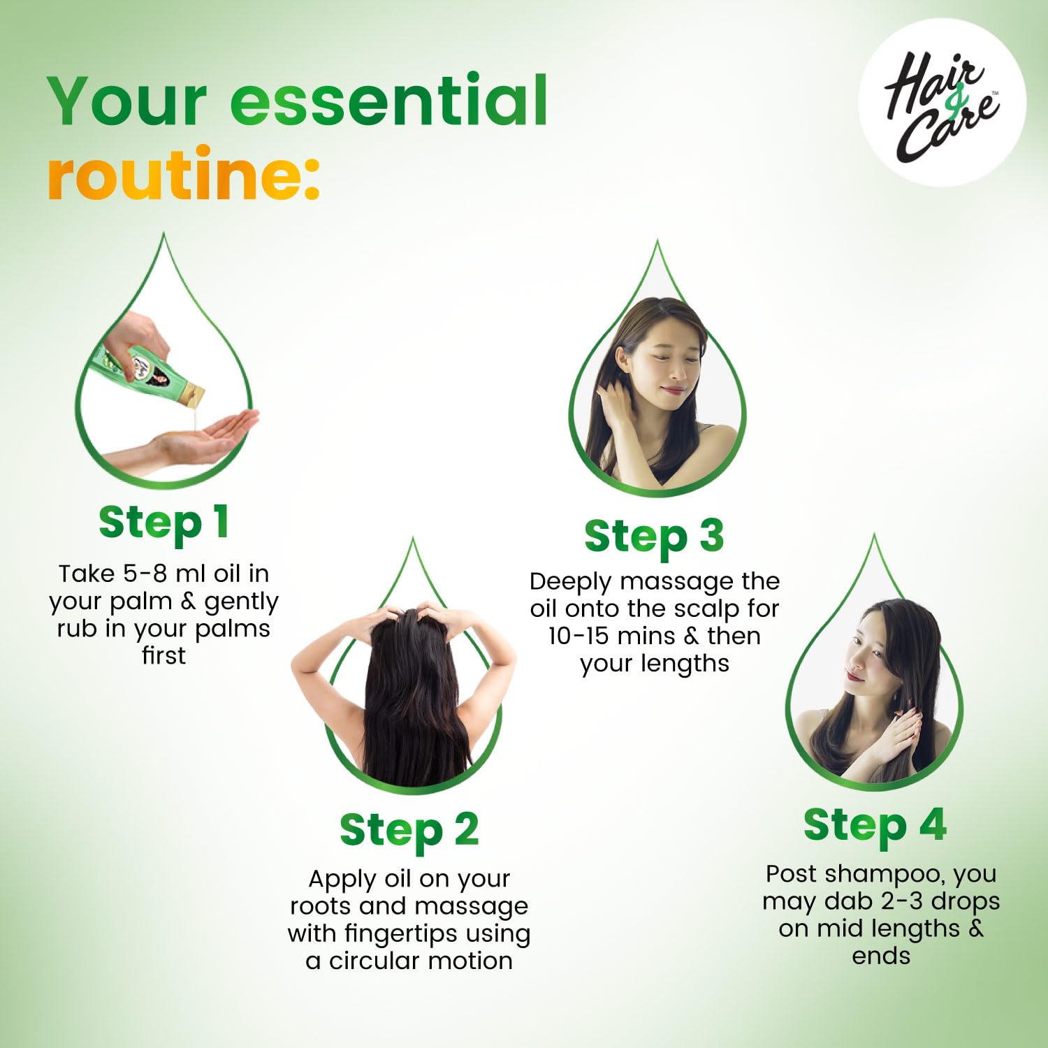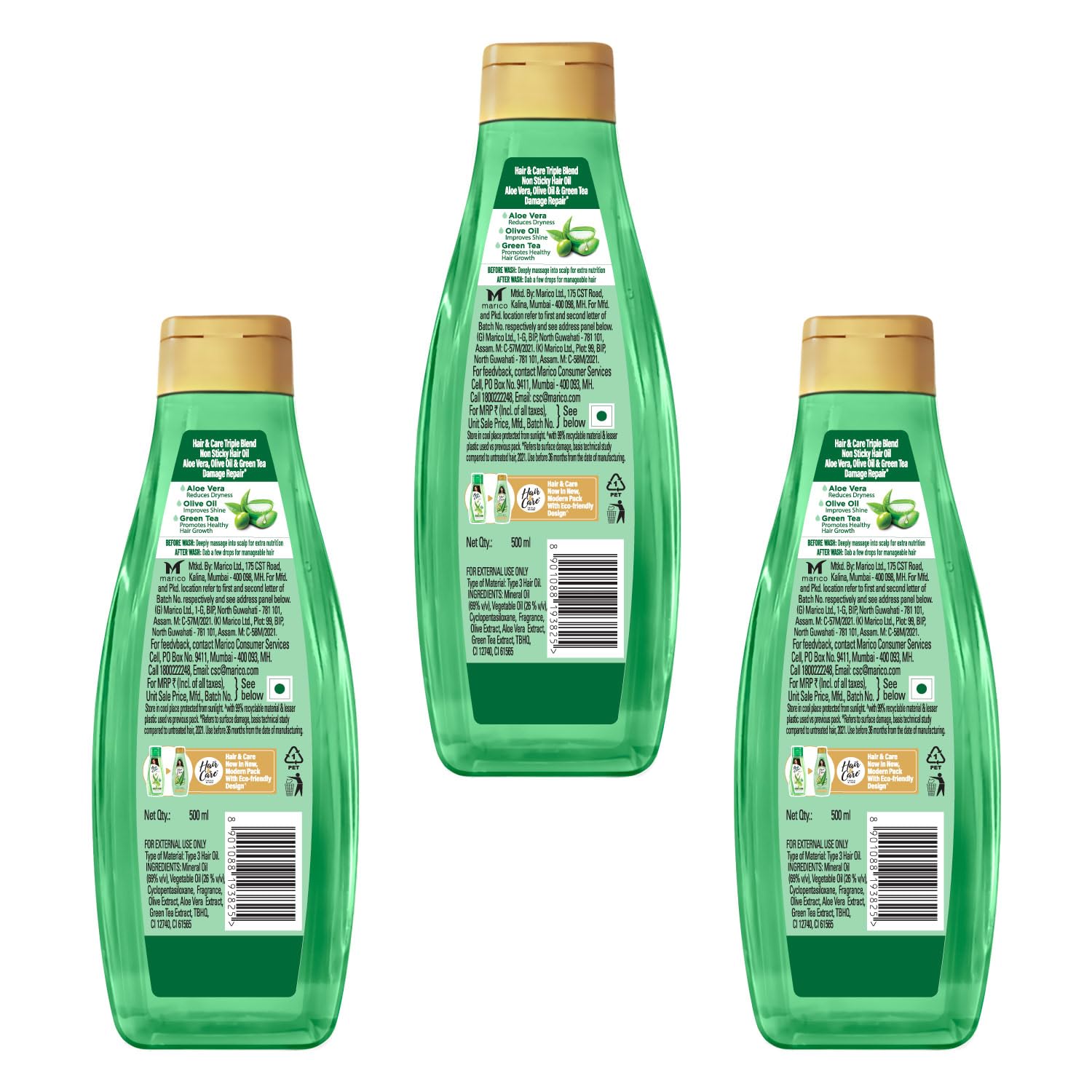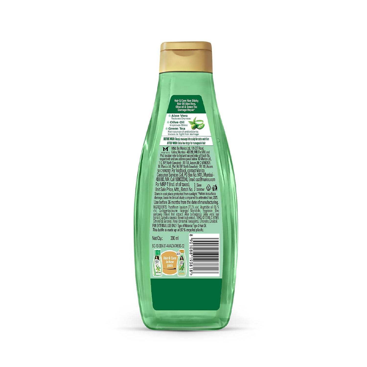 Now Say Goodbye to your hair worries! The new Hair & Care Triple Blend Oil enriched with Aloe Vera, Olive Oil & Green Tea repairs up to 100 % hair damage*. It is light and non-sticky and comes with the classic, loved Hair & Care fragrance. This hair oil cares for dry hair, frizzy hair and rough hair and helps repair these signs of damage to give soft, smooth & bouncy hair. It is enriched with Aloe Vera, Olive Oil and Green Tea. Aloe Vera soothes itchy scalp, reduces dryness, deep conditions the hair and protects it from sun damage thus leaving your hair soft, smooth and shiny hair. Olive oil, known to be rich in Vitamin E and antioxidants, moisturises hair, and prevents scalp irritation, giving strong and nourished hair. Green tea, rich in anti-fungal and anti-inflammatory properties, improves hair health and adds shine to damaged, dyed and chemically treated hair. The non-sticky and light formula of the hair oil also lets you set your hair post washing. Dab just a bit after wash and style it the way you want. Get damage free hair with the new Hair & Care Damage Repair Triple Blend Non-Sticky Hair Oil! *Refers to surface damage. Based on lab studies on hair breakage vs untreated hair.