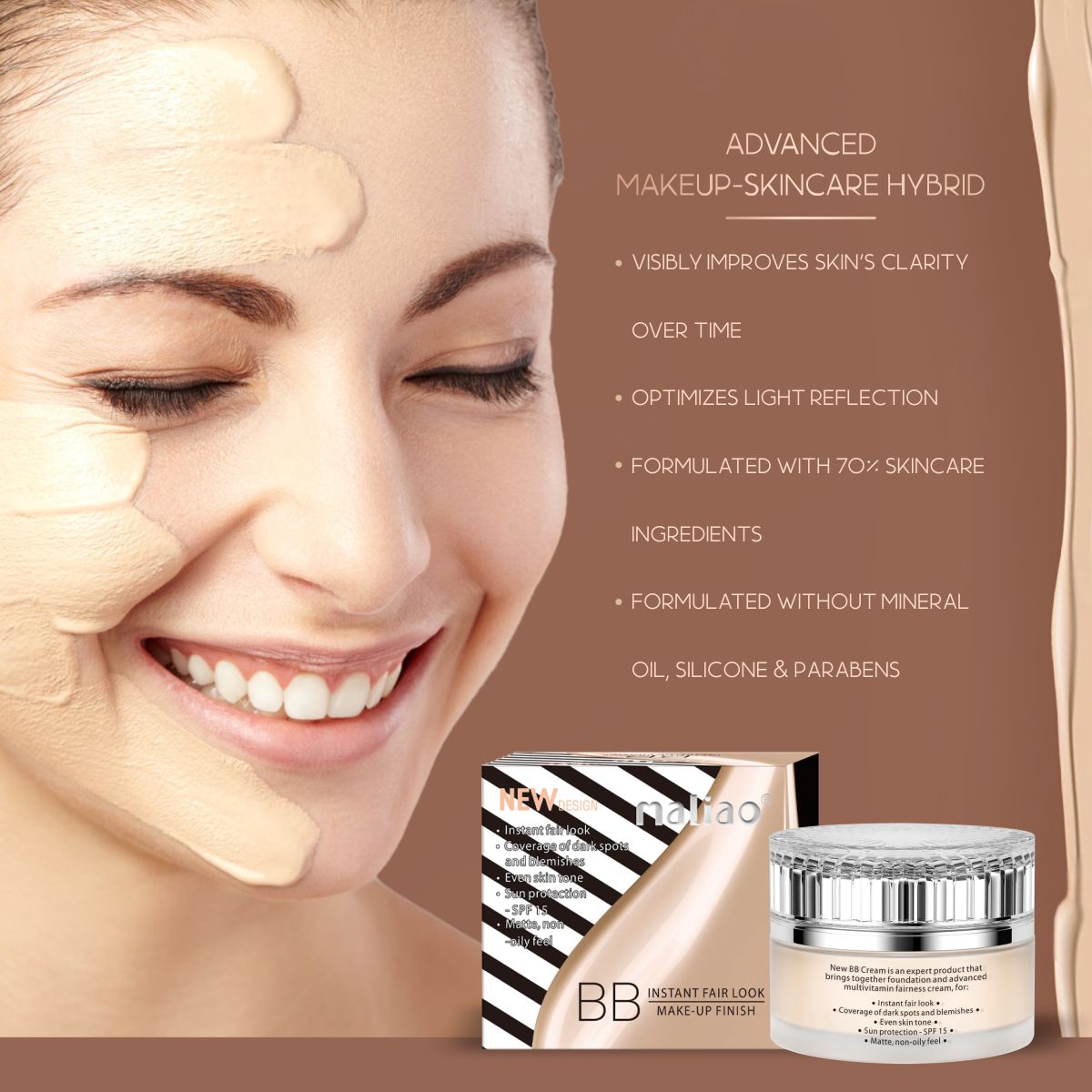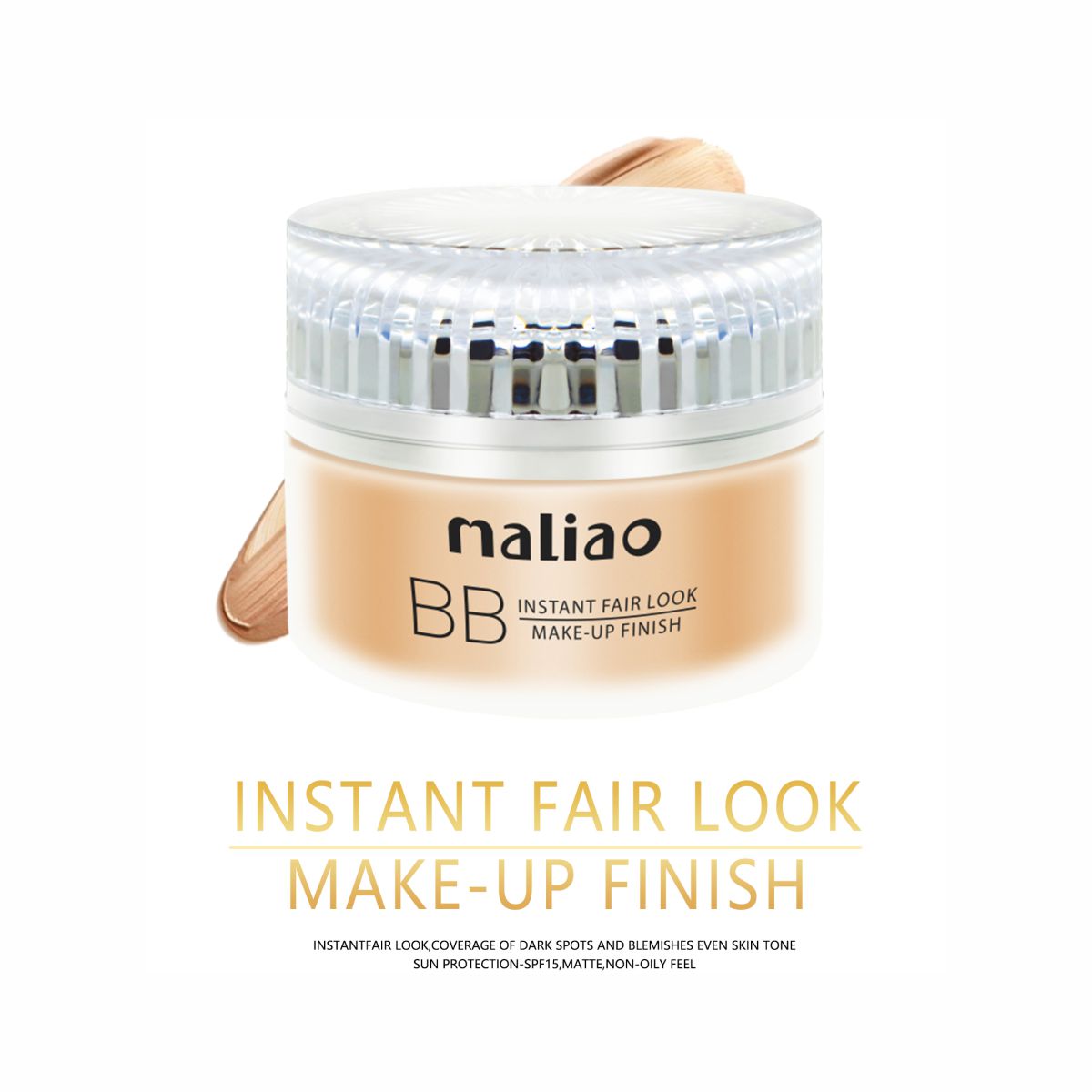 Introducing Maliao BB Instant Fair Look Make-up Finish Foundation, your key to glowing, flawless skin. This foundation combines skincare benefits with makeup perfection, providing SPF 15 protection and a lightweight, hydrating formula. It evens out skin tone, hides imperfections and makes your complexion naturally beautiful. Ready to wear all day long, Maliao BB Foundation provides a smooth, makeup finish without feeling heavy or sticky. Whether you're going for a casual day look or preparing for a special occasion, this foundation enhances the natural beauty of your skin while protecting it from harmful UV rays.