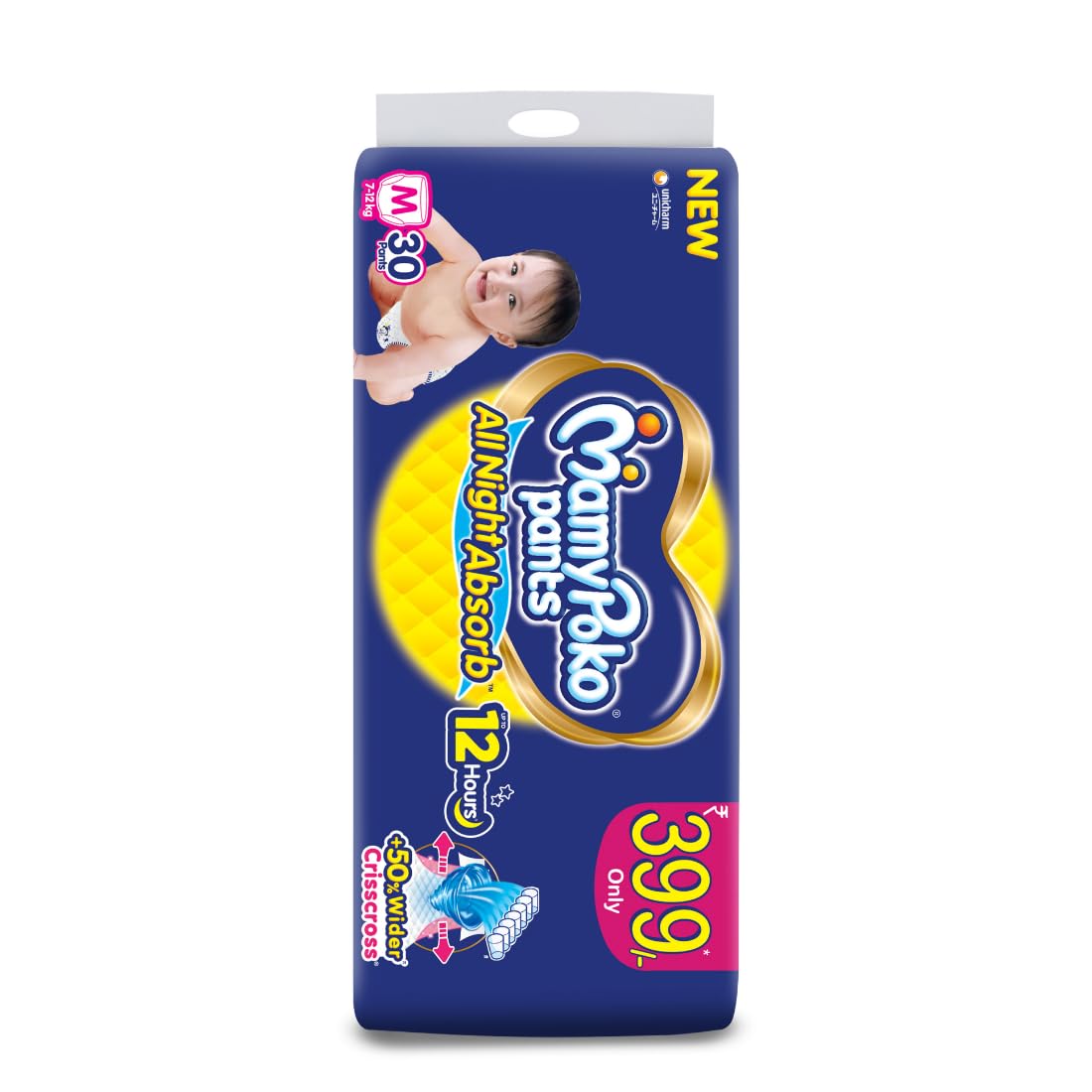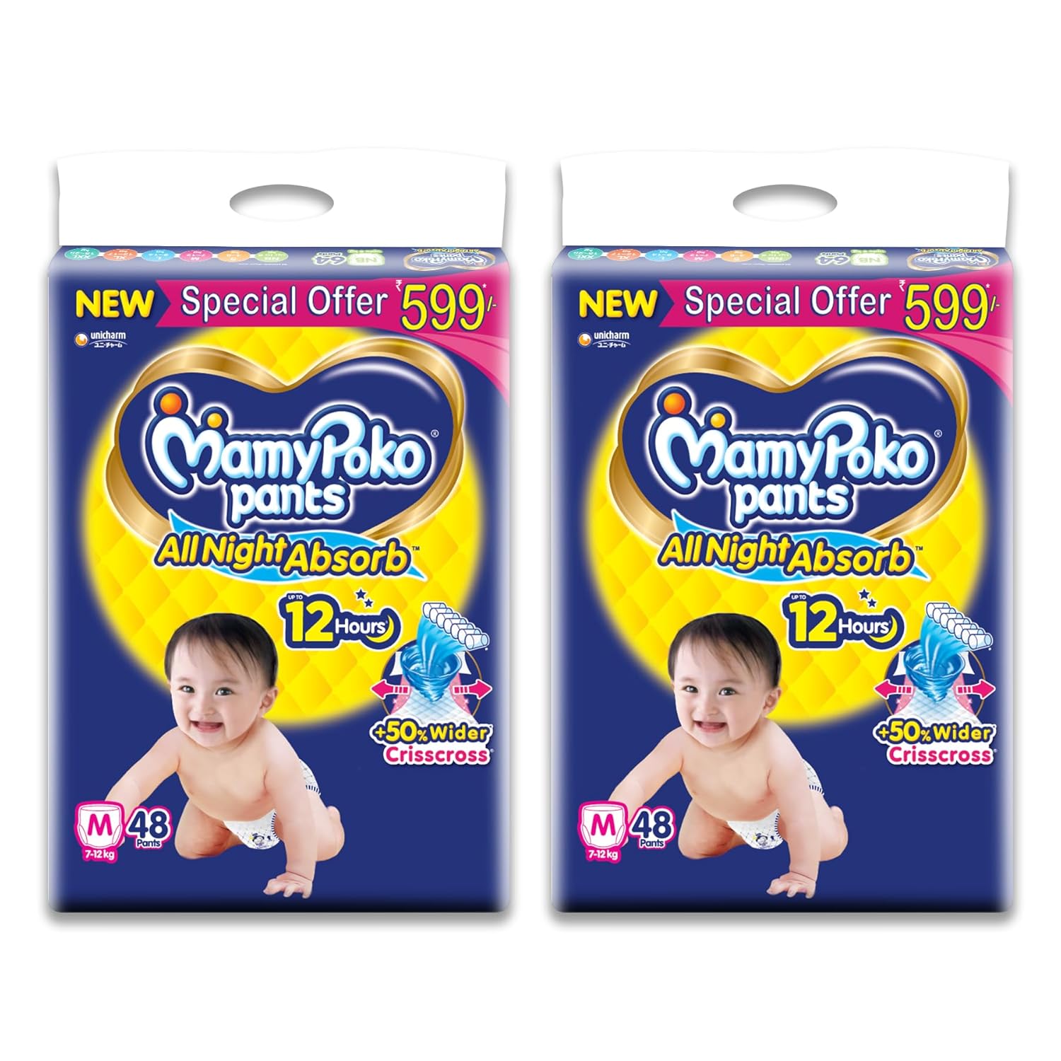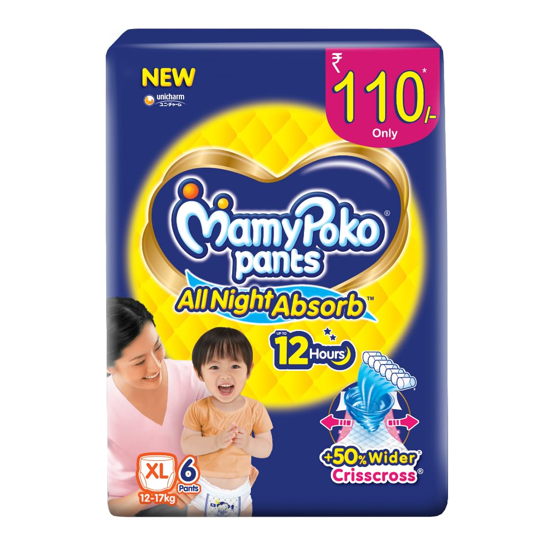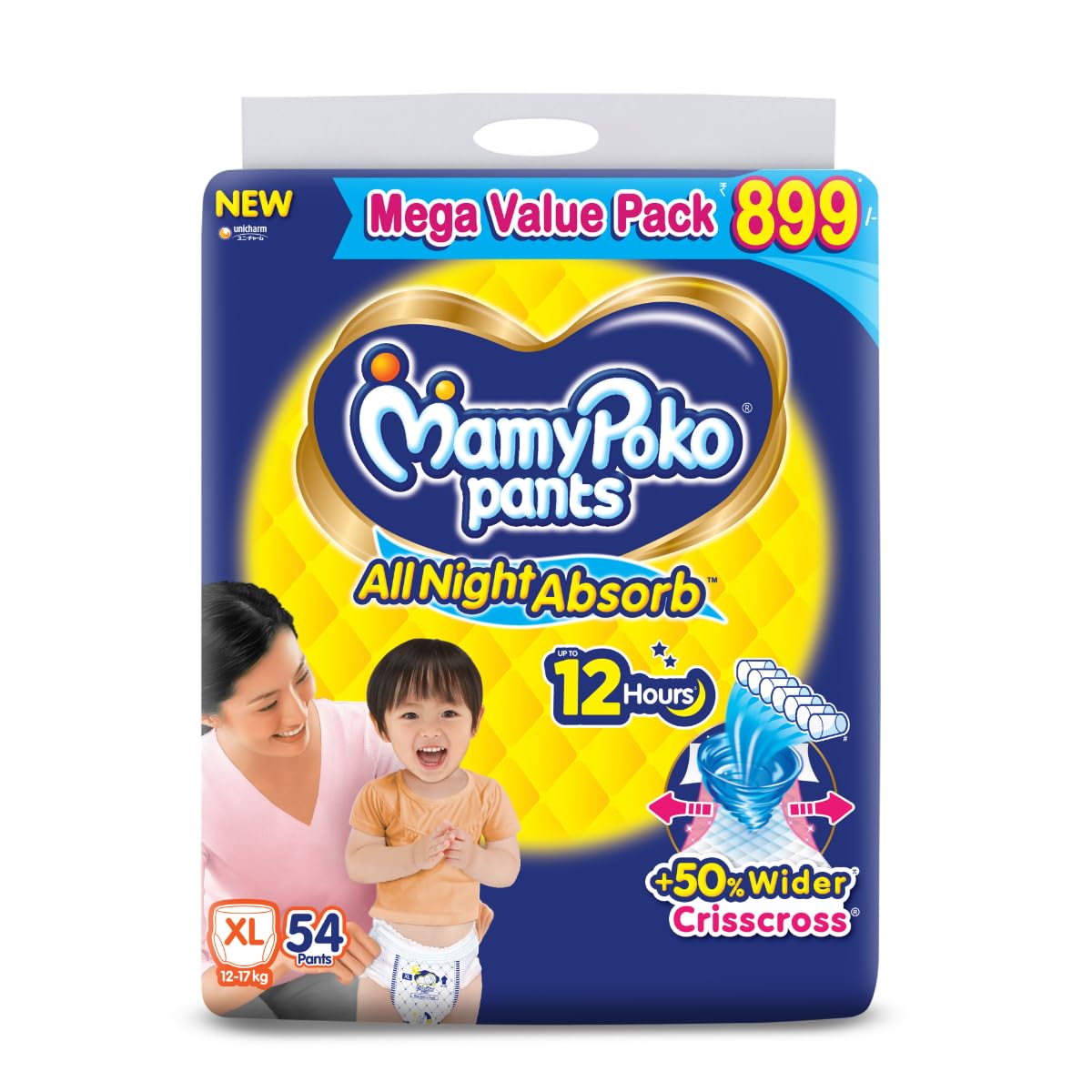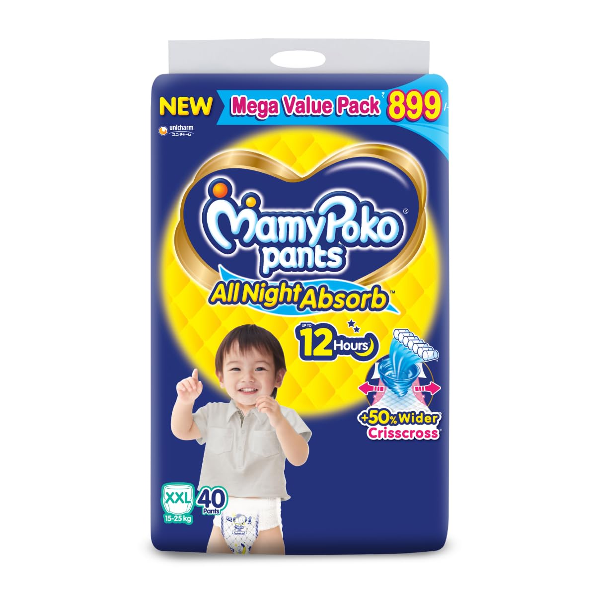 MamyPoko Pants All Night Absorb has +50% Widespread Crisscross absorption that absorb Widely & repeatedly for up to 12Hrs thus preventing leakage from heaviness.