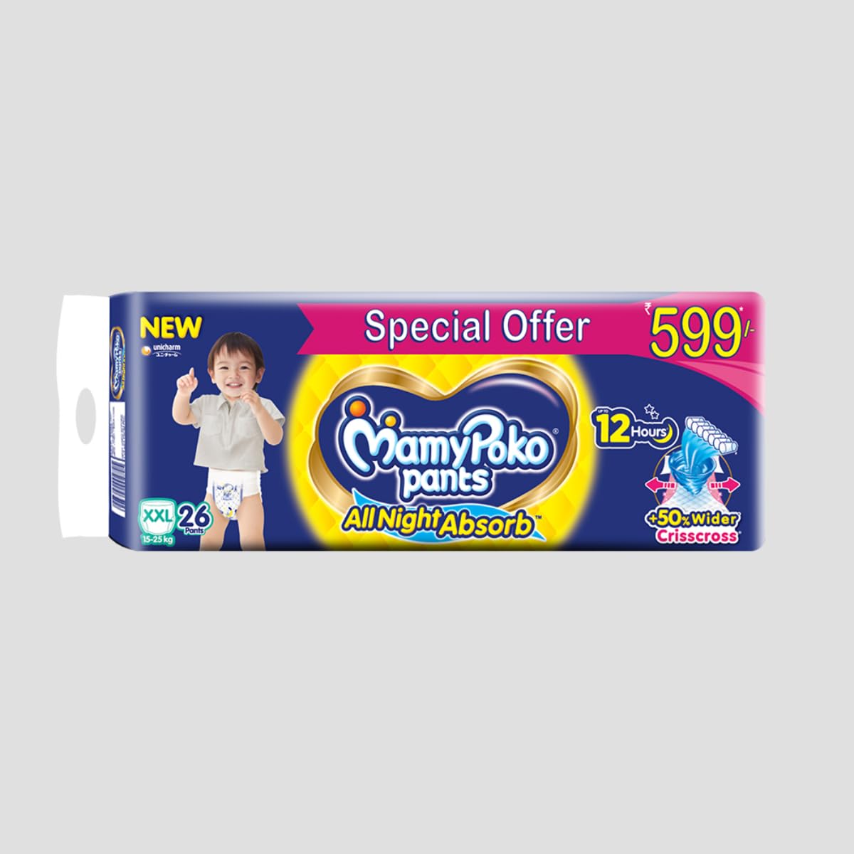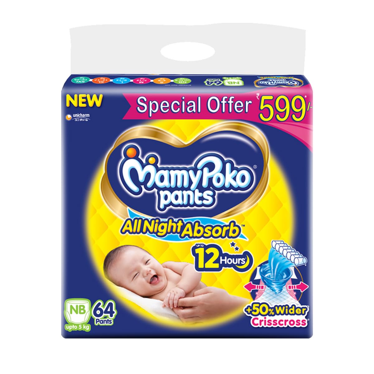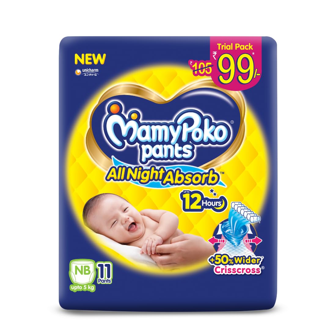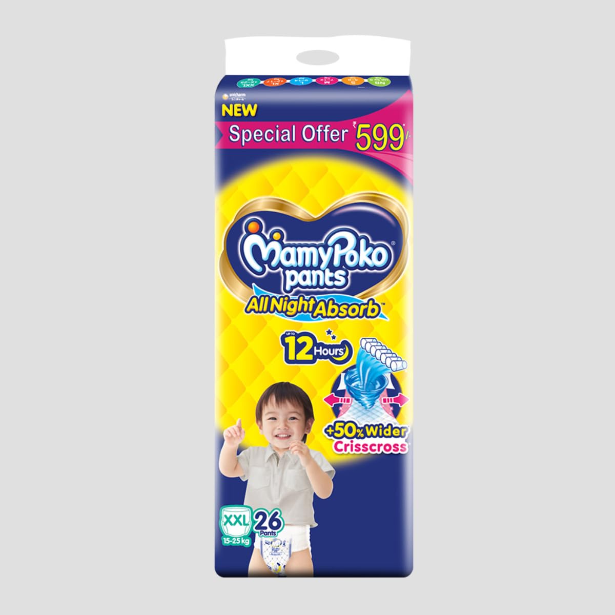 MamyPoko Pants All Night Absorb has +50% Widespread Crisscross absorption that absorb Widely & repeatedly for up to 12Hrs thus preventing leakage from heaviness.