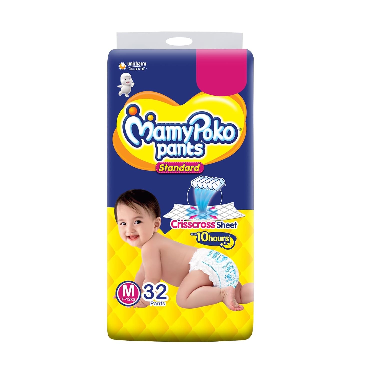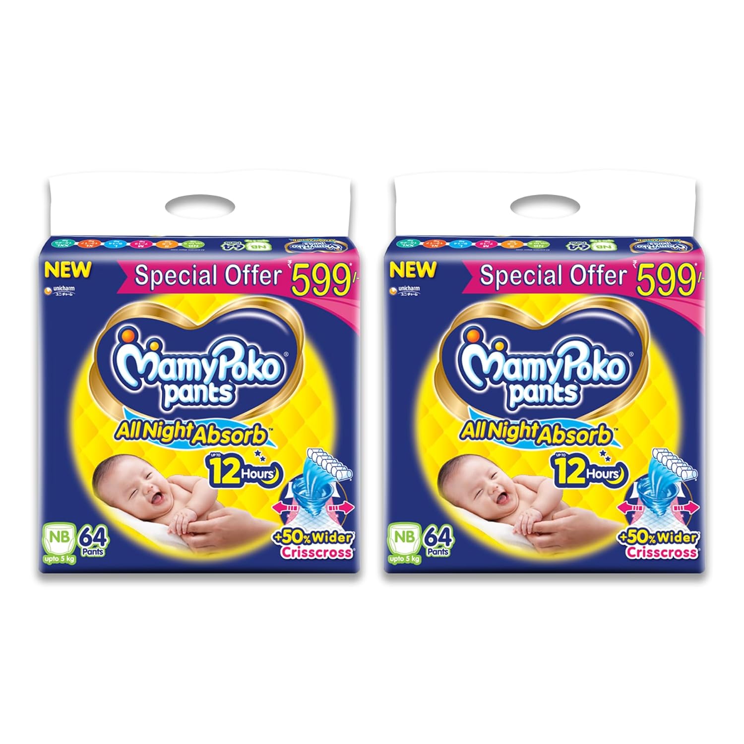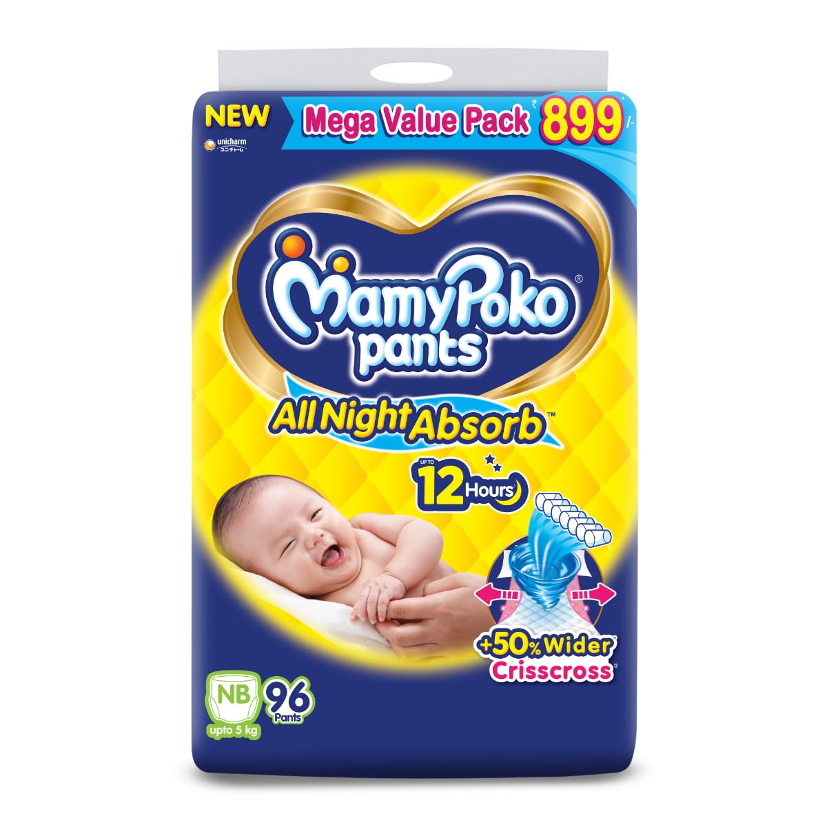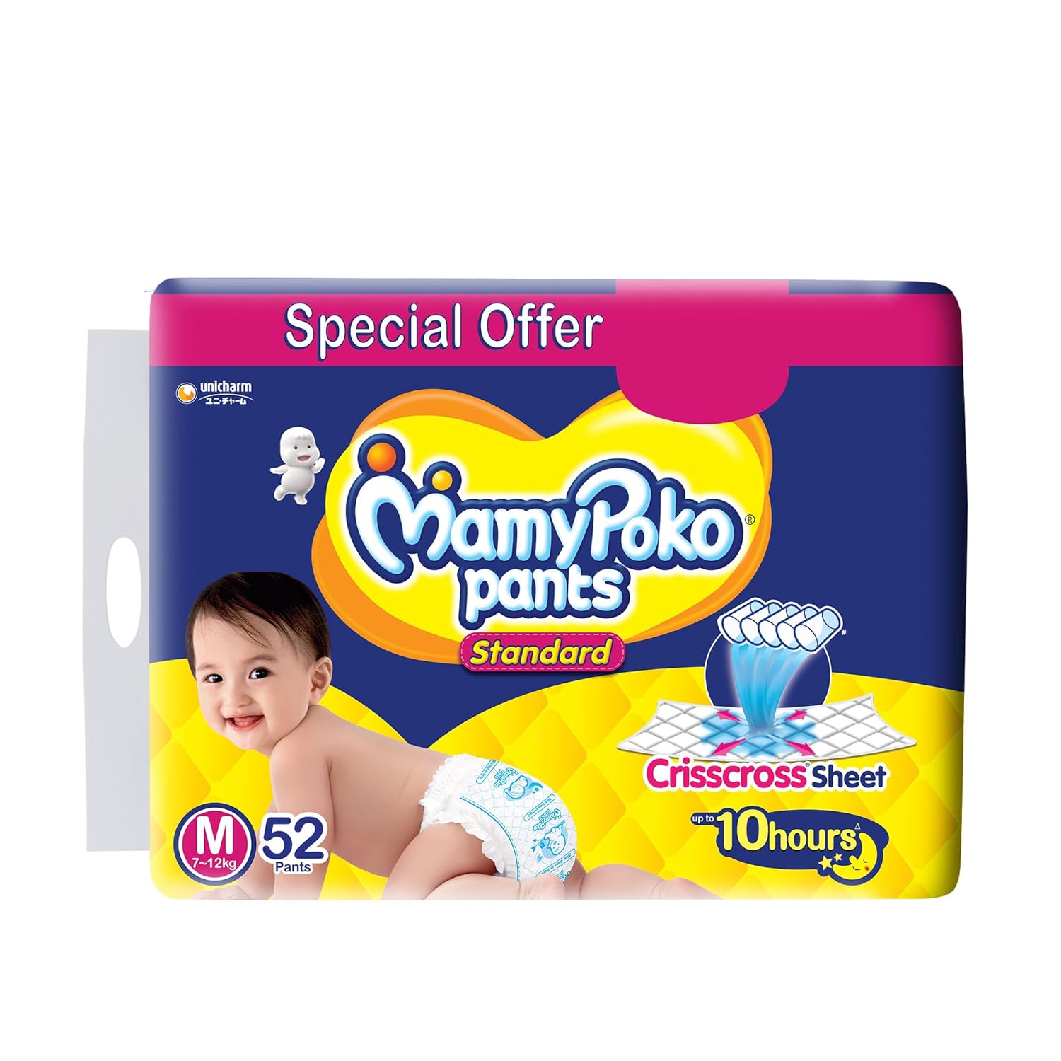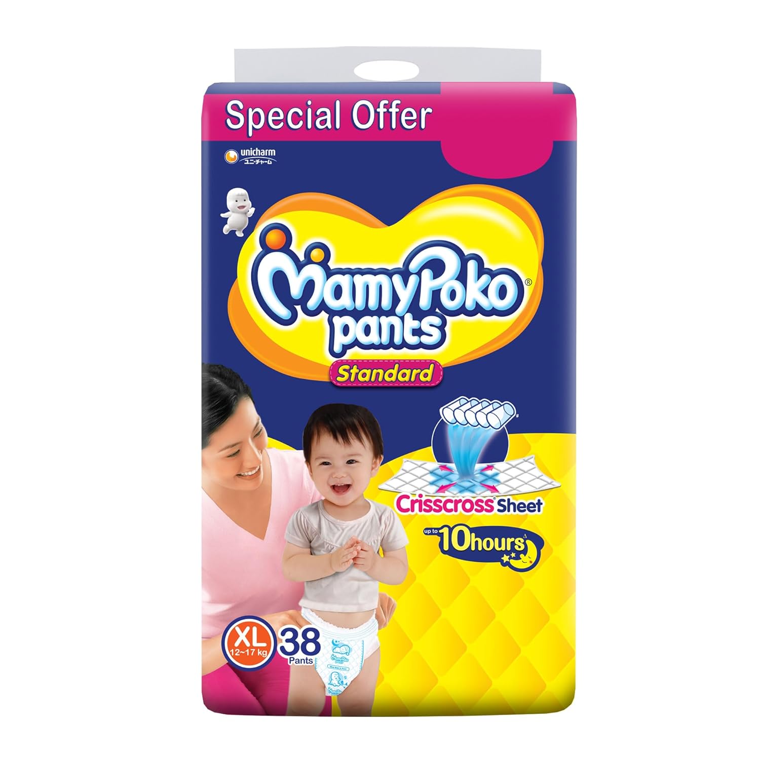 MamyPoko Pants All Night Absorb has +50% Widespread Crisscross absorption that absorb Widely & repeatedly for up to 12Hrs thus preventing leakage from heaviness.