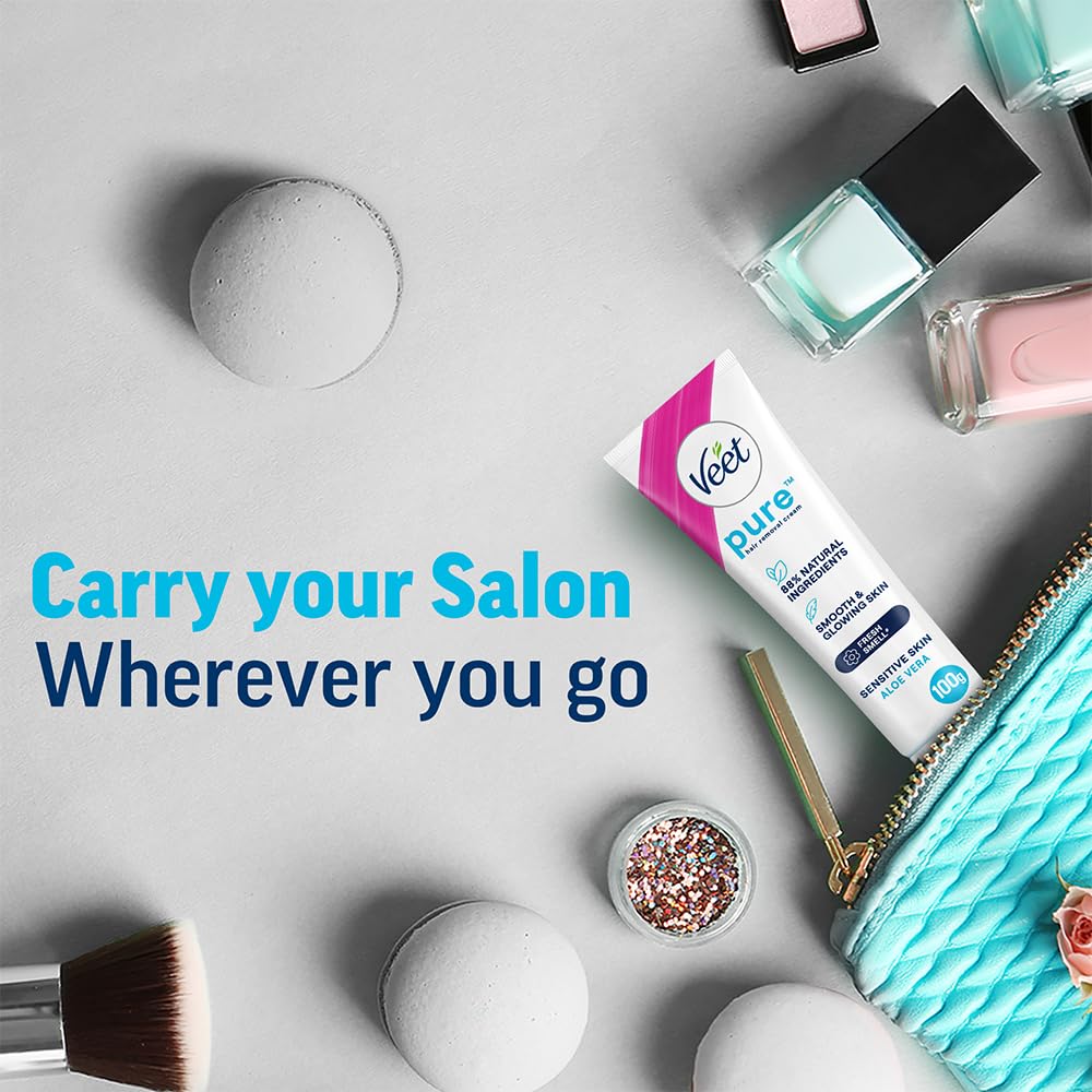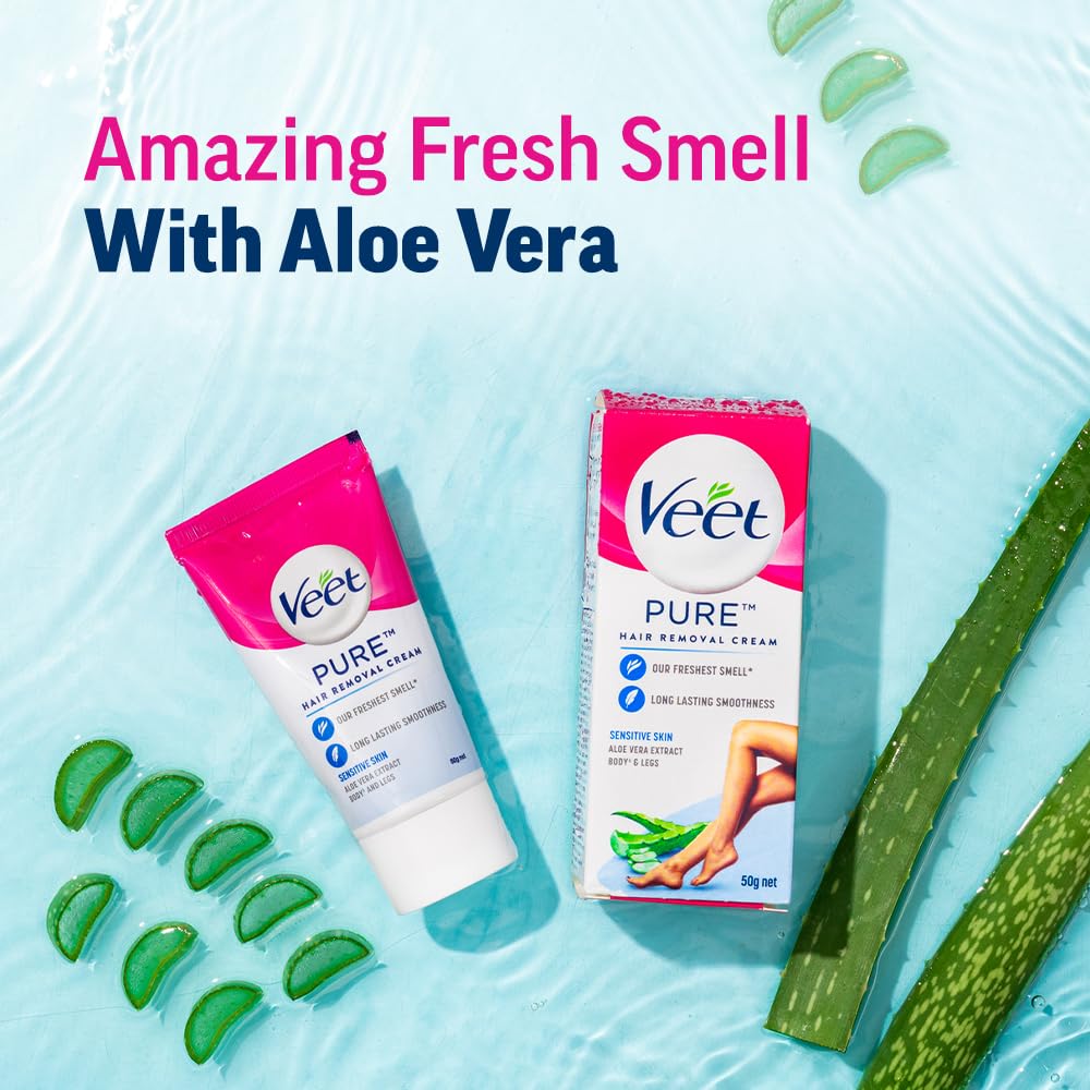 Get the smooth skin and the freedom to wear any look, any time with Veet. Veet Hair Removal Cream for Sensitive Skin, enriched with Aloe Vera and Vitamin E, is the right solution when going to the salon is not an option. It effectively removes even short stubborn hair and leaves skin moisturized for up to 24 hours*. It can be used on legs, arms, bikini line and underarms for a perfectly finished hair-less skin. Veet Hair Removal Cream for Sensitive Skin gives you perfect hair removal results in up to 10 minutes. Follow the steps mentioned on the pack using the spatula provided. Before using the product, please read pack precautions carefully. With regular use; get fewer, finer and softer hair growing back!