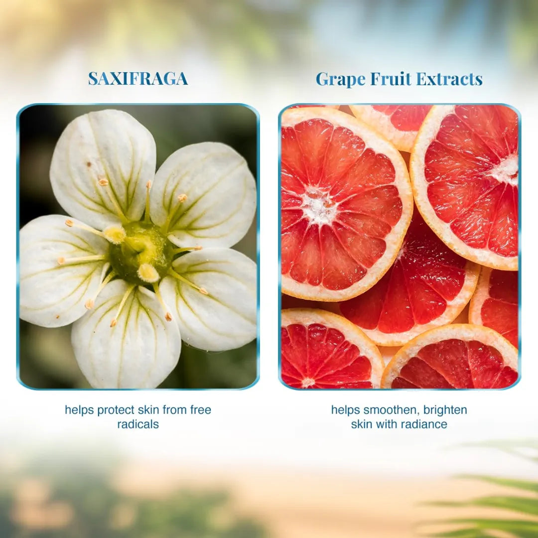 - The smooth and lightweight sunscreen contains Niacinamide, Mulberry bark extract, Saxifraga extract, Grapefruit extract, olive leaf extract, and Scutellaria root extract.